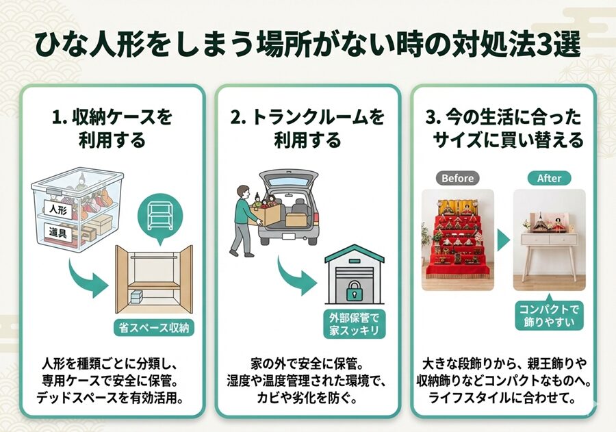 ひな人形をしまう場所がない時の対処法は、3つあります。