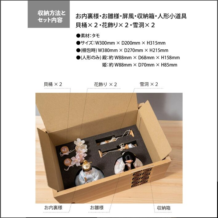 メーカー既存の箱から、ひな人形専用の収納箱に変えることにより、収納スペースを削減することができます。