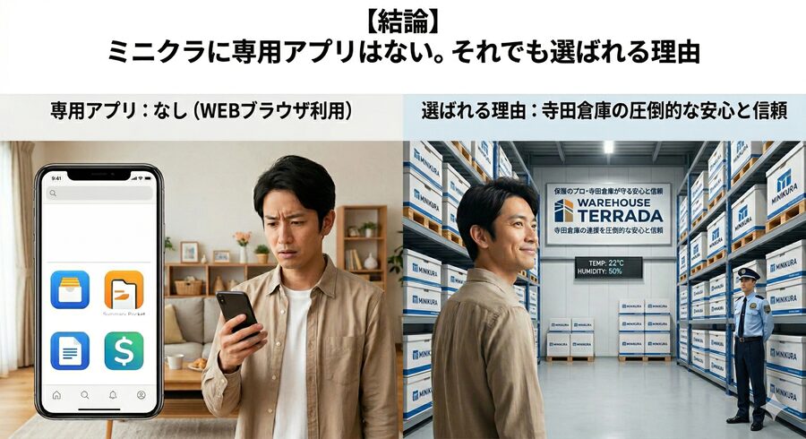アプリがないというデメリットを抱えながらも、ミニクラが宅配型トランクルームの王道であり続ける理由。