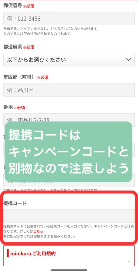 会員情報登録最下部の、提携コードはキャンペーンコードと別物なので注意が必要。